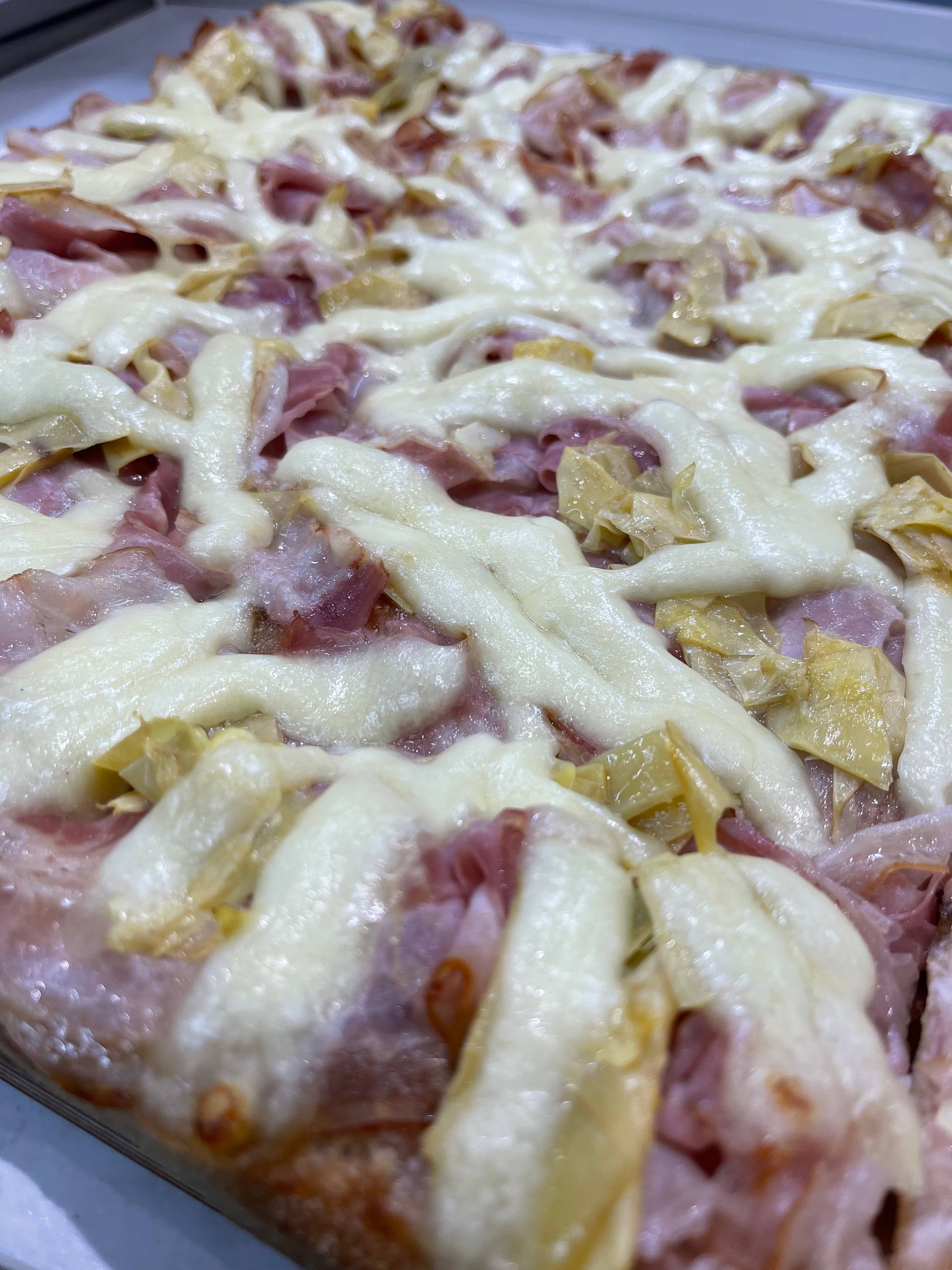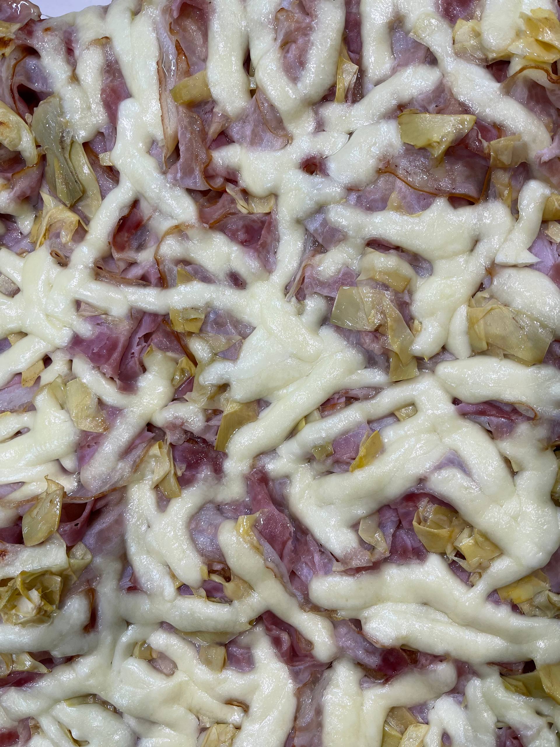 Ingrediente: sos de parmezan, prosciutto cotto, anghinare, mozzarella